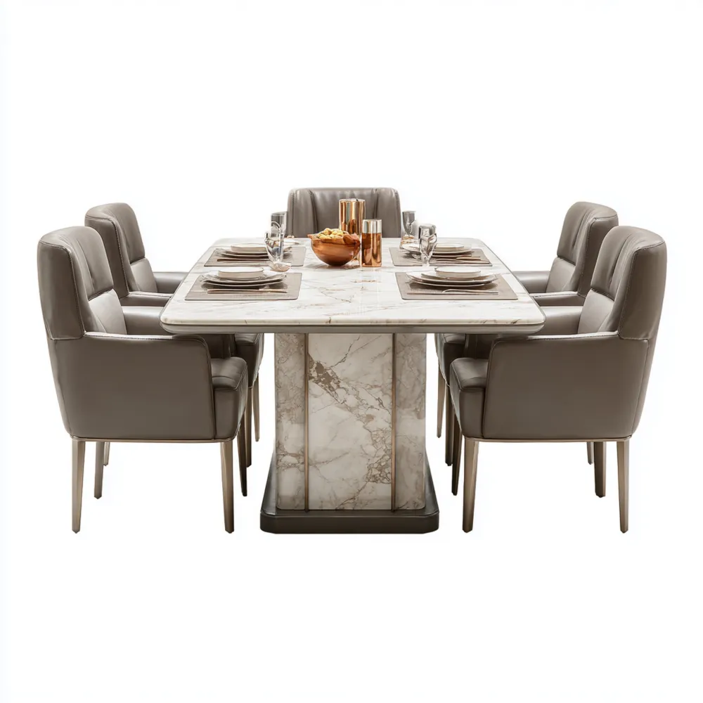 Material und VerarbeitungDer Tisch verfügt über eine robuste Oberfläche in Marmoroptik, während die Stühle mit hochwertigem Leder bezogen sind. Das Set ist in einem ansprechenden Grau gehalten.