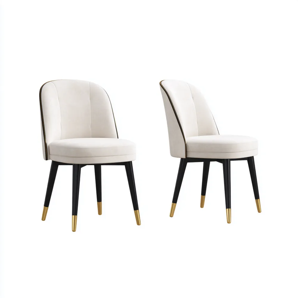 Material und VerarbeitungDie Stühle bestehen aus hochwertigem Samtstoff in der Farbe Cremeweiß. Die robusten Beine sind aus massivem Holz gefertigt und haben einen goldfarbenen Akzent an den Enden, der für zusätzliche Eleganz sorgt.