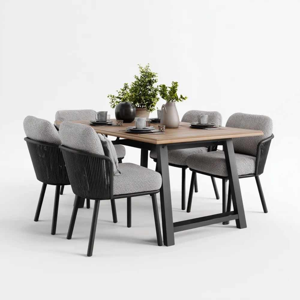Material und HandwerkDer Tisch besteht aus hochwertigem Holz mit einer glatten Oberfläche, während die Stühle mit wetterfestem, Hellgrauem Stoff bezogen sind, der einladend und pflegeleicht ist.