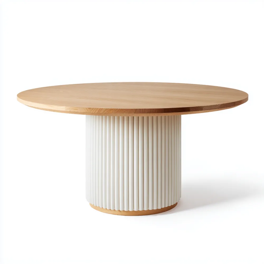 Material und VerarbeitungDer Tisch besteht aus einer robusten Holzplatte mit einem naturfarbenen Finish, unterstützt von einer eleganten weißen Säule. Die hochwertige Verarbeitung garantiert Langlebigkeit und Ästhetik.